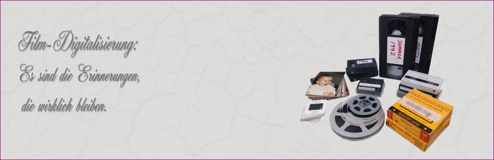 Überführen Sie Ihre Filmschätze jetzt ins digitale Zeitalter! Denken Sie daran: Filmrollen unterliegen einem Alterungsprozess, diese wichtigen Andenken verlieren zunehmend an Bildqualität oder können sogar unwiederbringlich verlorengehen. Überlassen Sie Ihre Urlaubserinnerungen oder die Aufnahmen von Familienfeiern deshalb lieber den Profis!